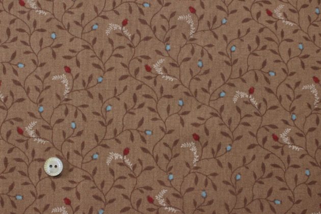 ↑ 明るめの茶色に、つる性植物と、白い羽根のようなプリント。ボタンの直径は1cmです。
